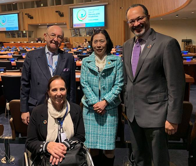 Pictured: Back row - Ambassador Luis Gallegos, Permanent Representative of Ecuador to the United Nations, IDPP Joint Advisory Boar, Chair; Akiko Ito, Chair, Secretariat for the Convention on the Rights of Persons with Disabilities, UN Department of Economic and Social Affairs (DESA). Seated - Candace Cable, 9-time gold medalist, 12-time medalist, and US International Council on Disability (USICD) Board Member.